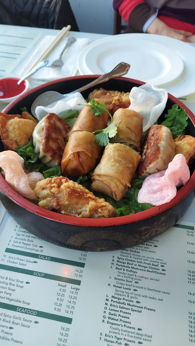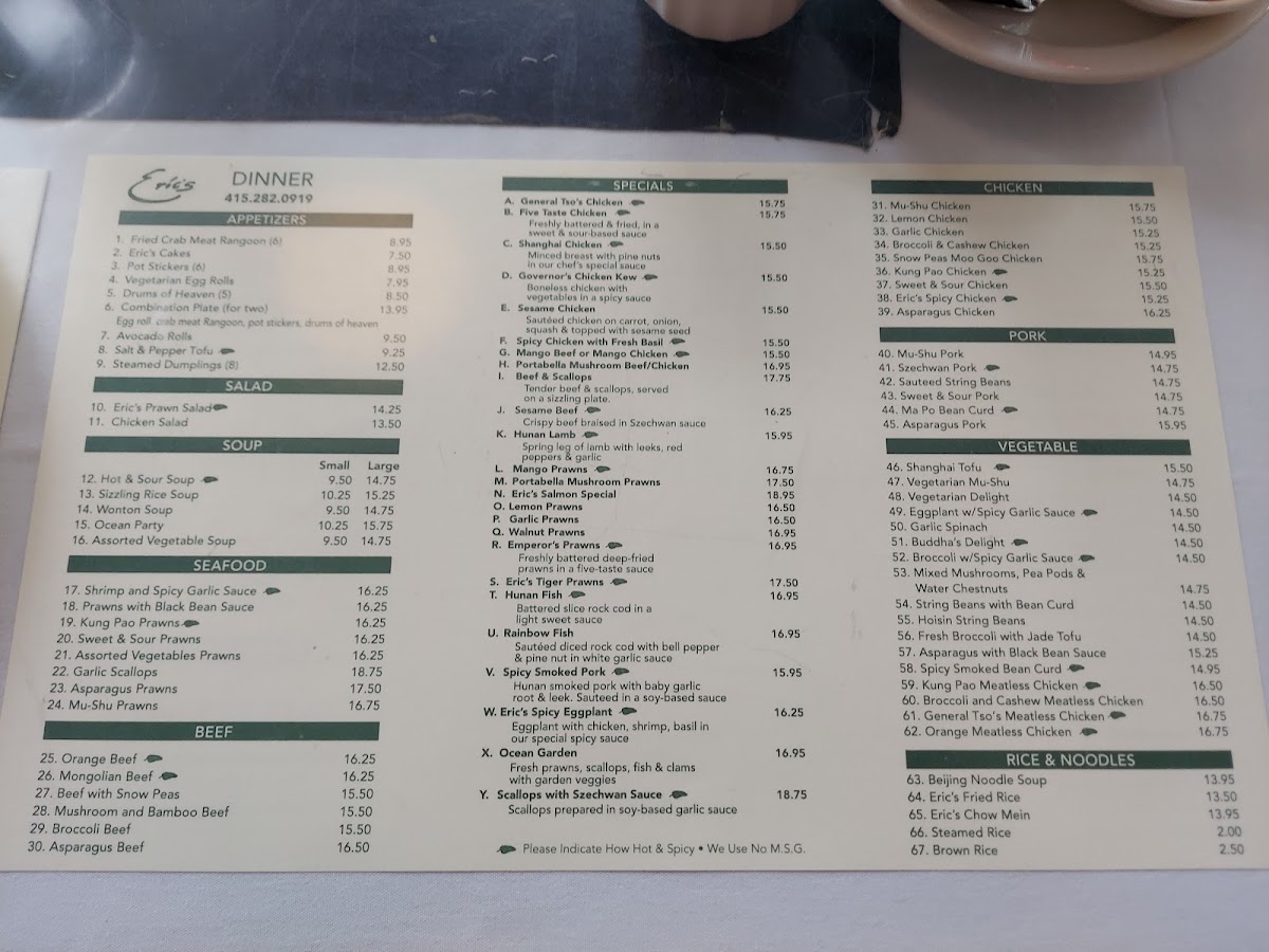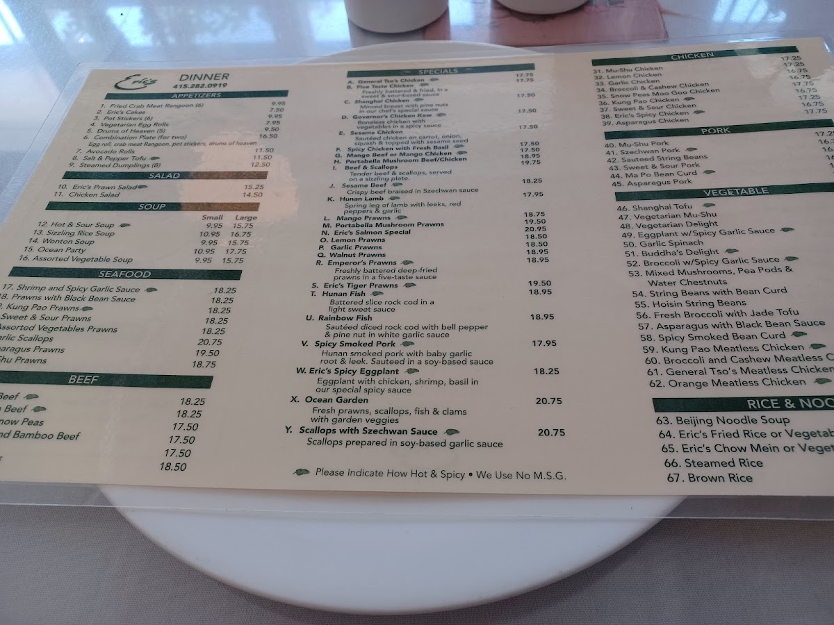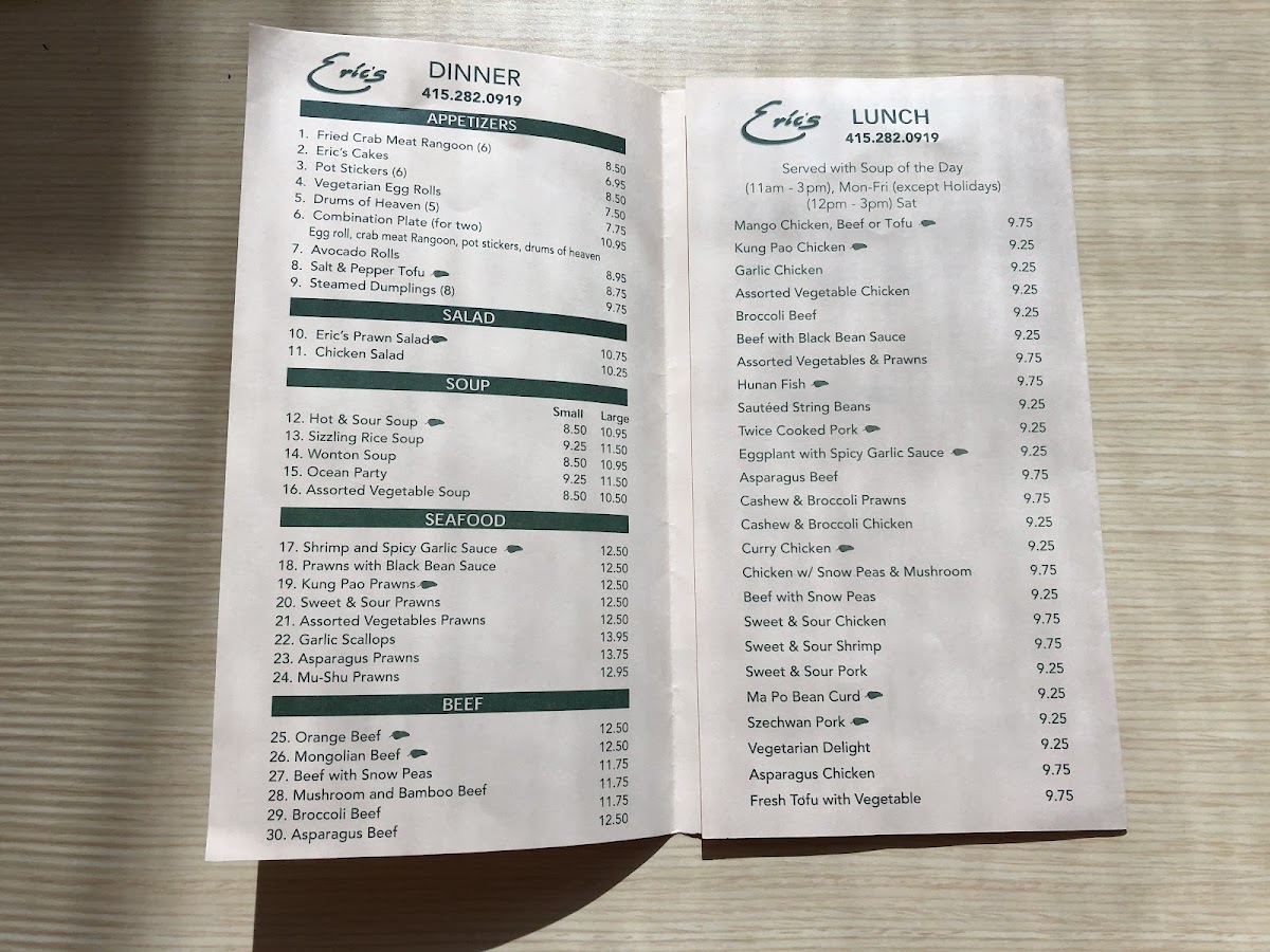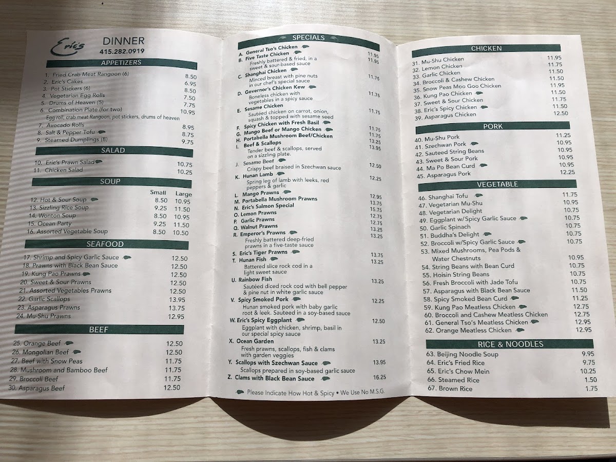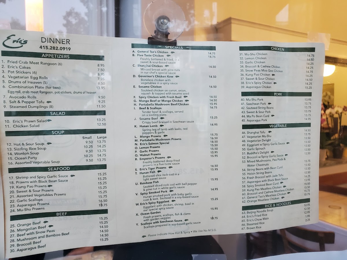 Eric's menu is a feast for the senses, featuring a delightful selection of appetizers and mains. Start your culinary journey with the Steamed Dumplings—eight delectable pockets of juicy pork steaming with savory goodness, or try the Fried Crab Meat Rangoon that offers a perfect crunchy exterior giving way to a creamy, flavorful center.